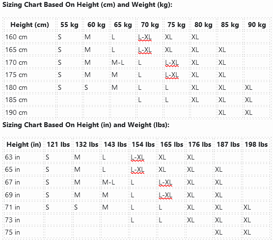 Sizing Chart Based On Height (cm) and Weight (kg):