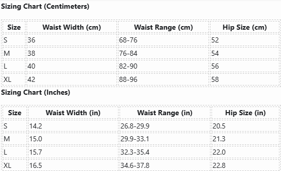 | Size | Waist Width (cm) | Waist Range (cm) | Hip Size (cm) |