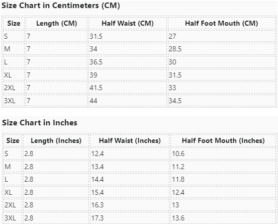 | Size | Length (CM) | Half Waist (CM) | Half Foot Mouth (CM) |