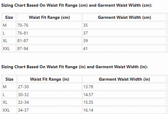 Sizing Chart Based On Waist Fit Range (cm) and Garment Waist Width (cm):