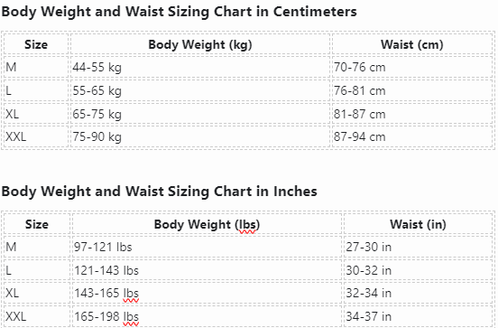 | Size | Body Weight (kg) | Waist (cm) |