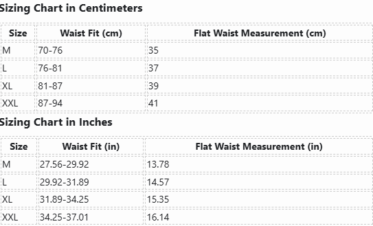 | Size | Waist Fit (cm) | Flat Waist Measurement (cm) |