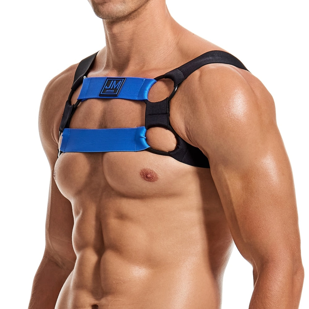 Perfect for club wear, marching in a PRIDE parade, sending pics through Grindr, or using in the bedroom, this Jockmail Elastic Shoulder Harness is a great beginner harness.