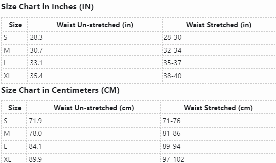 | Size | Waist Un-stretched (cm) | Waist Stretched (cm) |