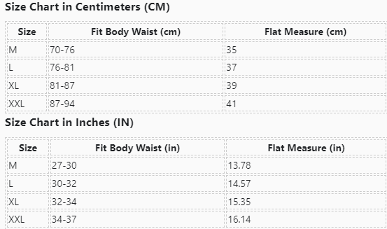 | Size | Fit Body Waist (cm) | Flat Measure (cm) |