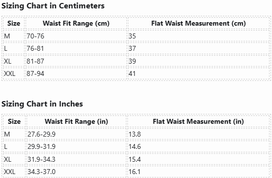 | Size | Waist Fit Range (cm) | Flat Waist Measurement (cm) |