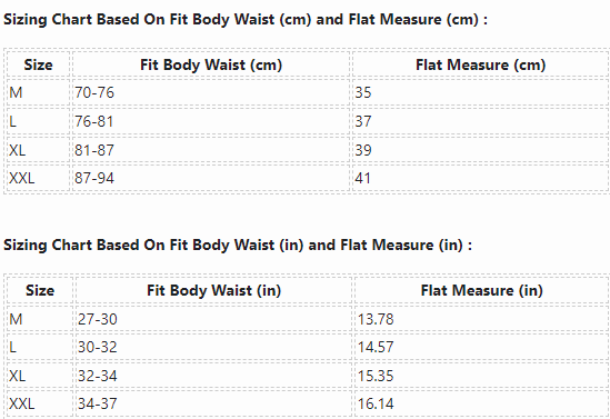 Sizing Chart Based On Fit Body Waist (in) and Flat Measure (in) :