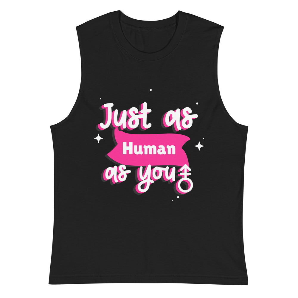 Let's not just wear the Just As Human As You Muscle Tank; let's werk it, serve it, and slay in it, turning every sidewalk into a runway and every glance into an ovation. It's time to live out loud, love hard, and sparkle like the fierce, fabulous beacon of queer magnificence you are. Honey, the world isn't ready for you—but it needs you none the less! .