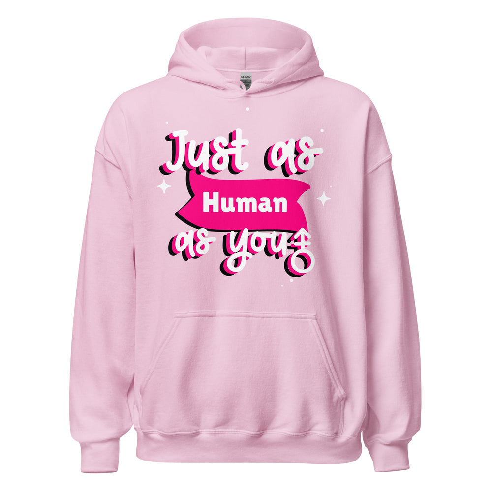 This Just As Human As You Unisex Hoodie? It’s not just soft, it’s like wrapping yourself in a cloud made of dreams and fierce queer magic. The kind of cozy that makes you wanna strut your stuff from the living room to the club, turning sidewalks into runways and yoga mats into dance floors. It’s so extra, you’ll never want to take it off, serving comfort realness 24/7.