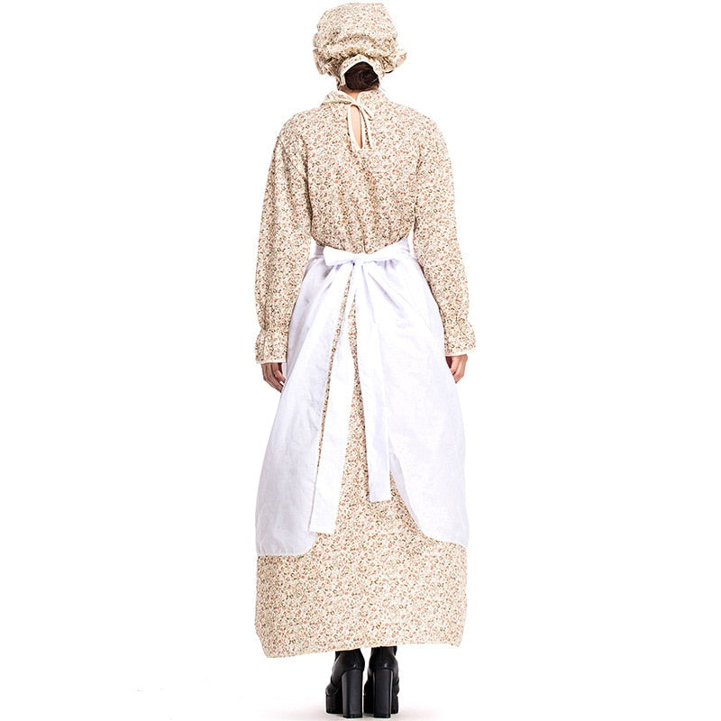 The costume is complete with a baggy dress, apron, and bonnet, and features a granny-chic floral print design for that antiquated style. It is made of a polyester-blend material that is comfortable and of good quality.