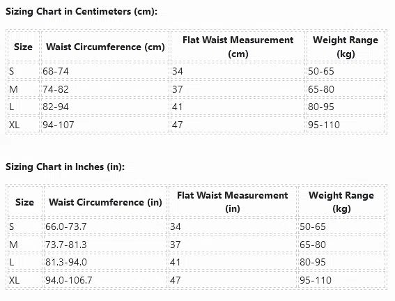| Size | Waist Circumference (cm) | Flat Waist Measurement (cm) | Weight Range (kg) |