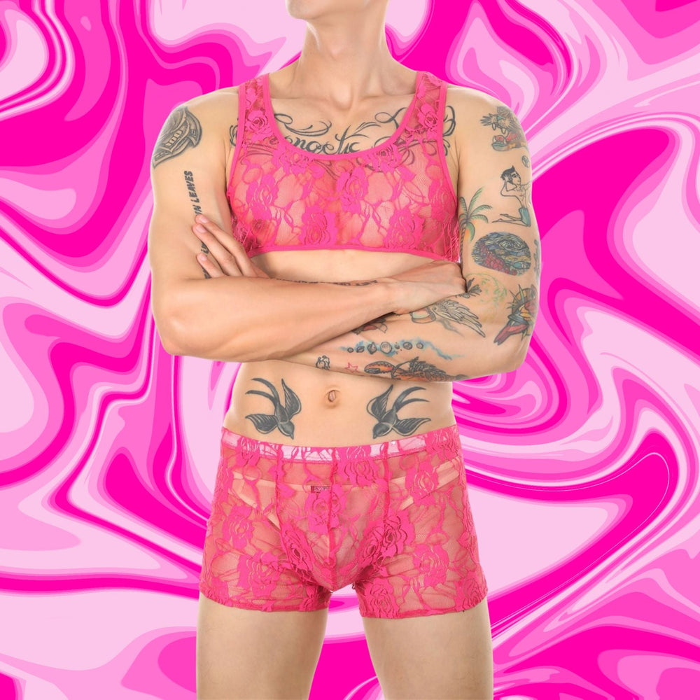 Made from delicate-yet-daring floral lace, this set is soft, sheer, and just explicit enough to keep things interesting. The crop top clings in all the right ways, while the boxers hug, tease, and tantalize—leaving just enough to the imagination, but not enough to be mistaken for modesty. If you’re looking for that ultimate gender-f*ck, sex-positive, feel-yourself moment, this is it.