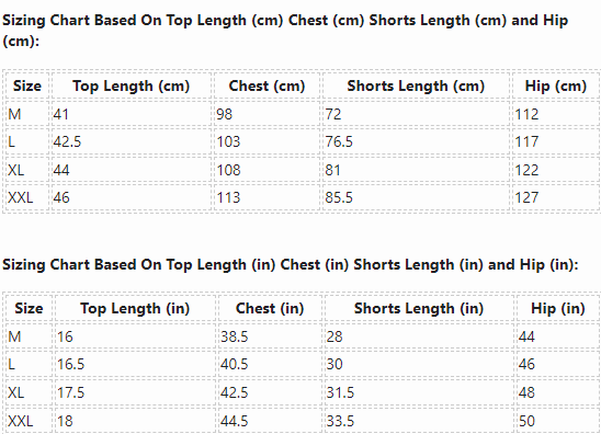 Sizing Chart Based On Top Length (cm) Chest (cm) Shorts Length (cm) and Hip (cm):