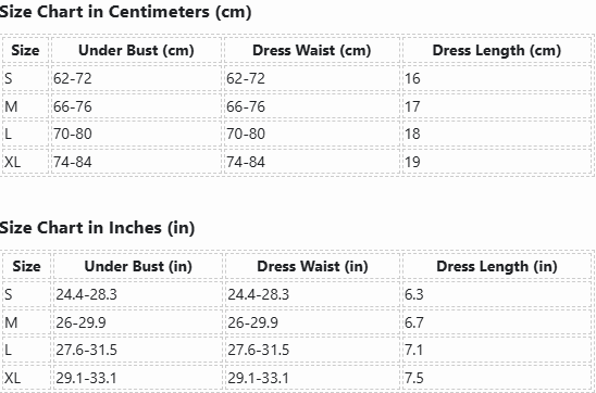 | Size | Under Bust (cm) | Dress Waist (cm) | Dress Length (cm) |
