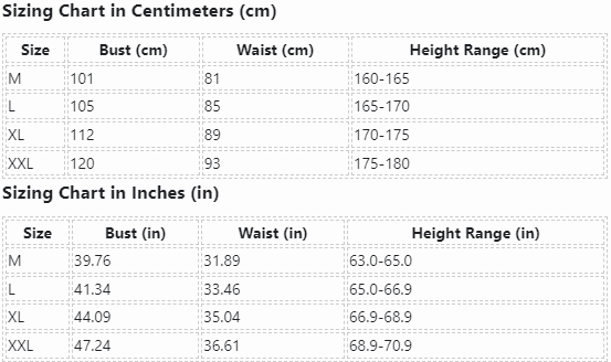 | Size | Bust (cm) | Waist (cm) | Height Range (cm) |