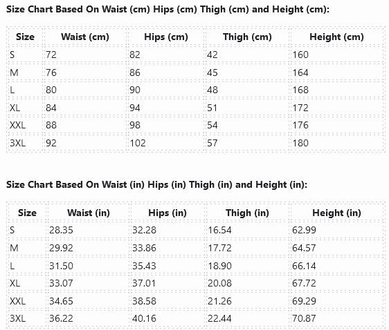 Size Chart Based On Waist (cm) Hips (cm) Thigh (cm) and Height (cm):