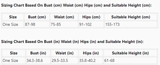 Sizing Chart Based On Bust (in) Waist (in) Hips (in) and Suitable Height (in):