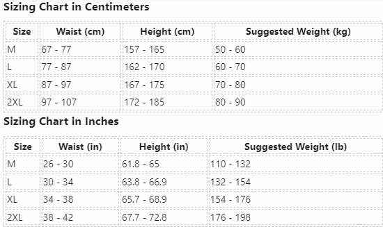| Size | Waist (cm) | Height (cm) | Suggested Weight (kg) |
