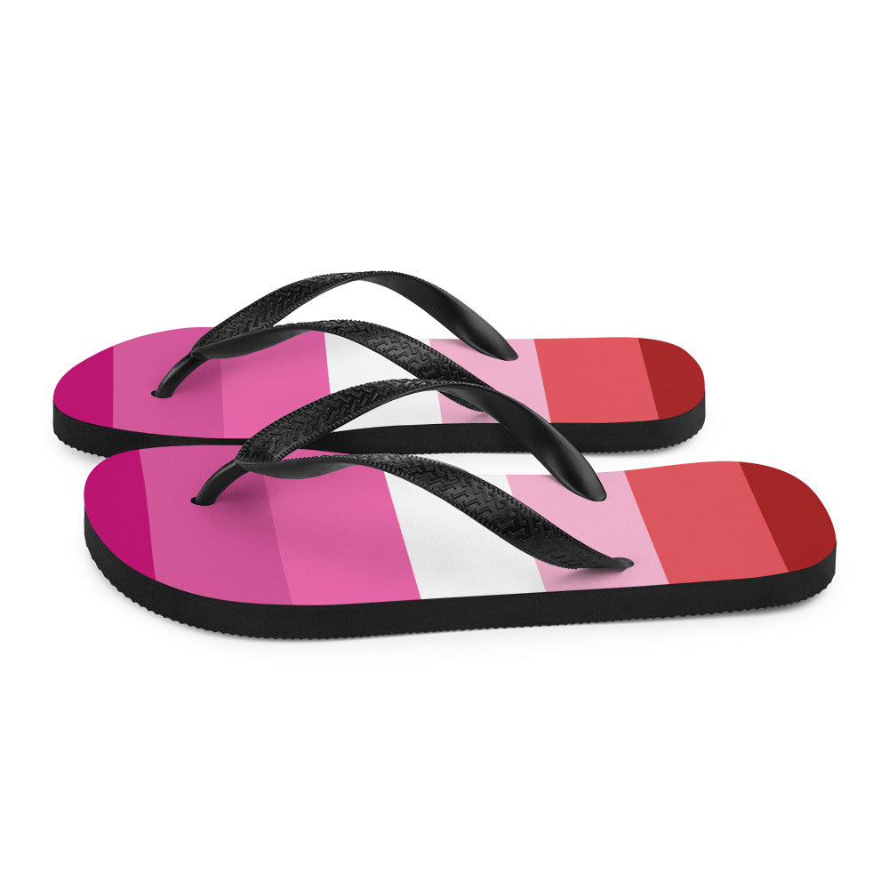 You will adore the sensational use of color here. These flip flops proudly show the lesbian pride flag colors on their footbeds. These colors represent independence, community, serenity, femininity, and peace, among other things.