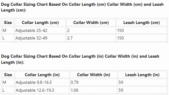 | Size | Collar Length (cm) | Collar Width (cm) | Leash Length (cm) |