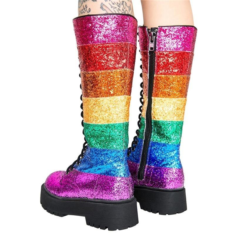 Set on a low heel platform of 1 cm-3 cm height and black lace-up option for a classic look and better grip, expect compliments from your left and right. The bright and bold mid-calf boots will always draw attention towards you with the shimmer and pride flag colors.