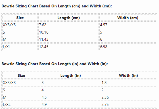 Bowtie Sizing Chart Based On Length (cm) and Width (cm):