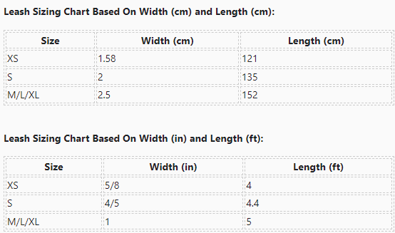 Leash Sizing Chart Based On Width (in) and Length (ft):