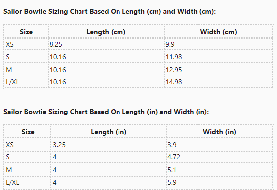Sailor Bowtie Sizing Chart Based On Length (cm) and Width (cm):