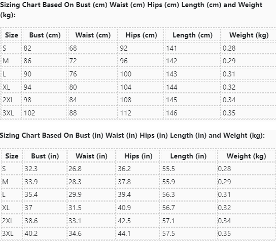 Sizing Chart Based On Bust (cm) Waist (cm) Hips (cm) Length (cm) and Weight (kg):
