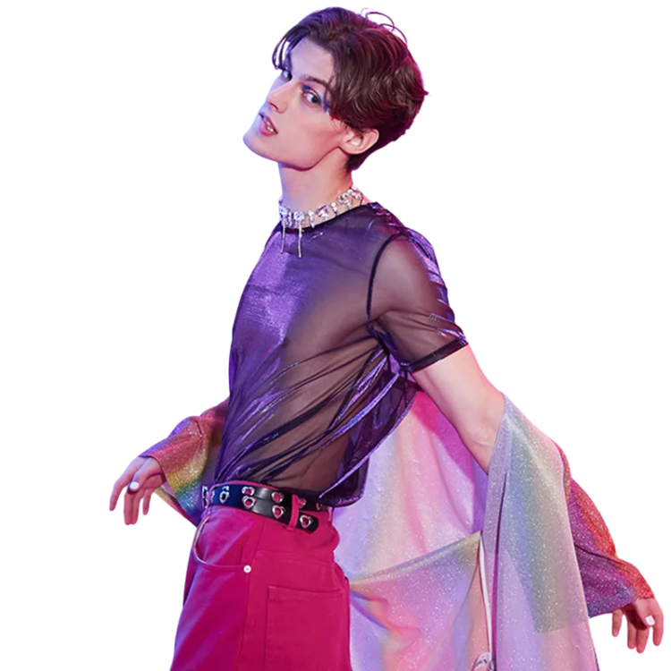 This tee is a tribute to all things bold and beautiful, inspired by icons of pride who teach us to live out loud—think of it as your very own 'Born This Way' banner, but make it fashion. With just the right amount of sheerness, it's perfect for showing off tattoos, that gym progress, or just your impeccable taste in underwear. Whether you're headlining the parade or just dancing in your living room, this mesh marvel is sure to turn heads and uplift hearts.