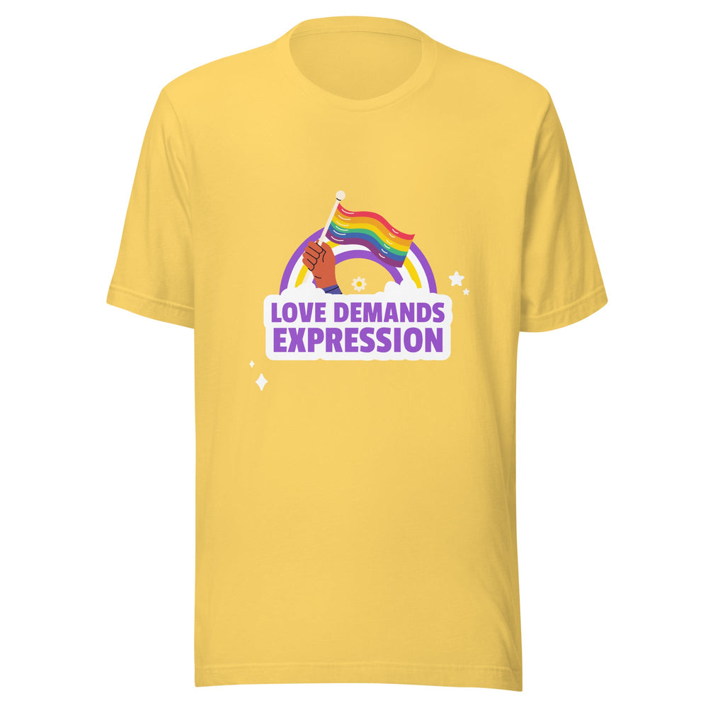 Buckle up, darling, because your wardrobe is about to get a major upgrade! Introducing the piece de resistance, the crème de la crème of queer fashion: a fitted, comfortable, and softer-than-your-ex's-heart 'Love Demands Expression T-Shirt' that’s been tailor-made just for you.
