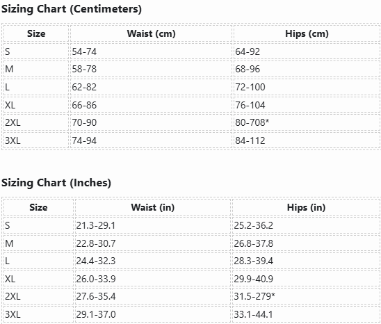 | Size | Waist (cm) | Hips (cm) |