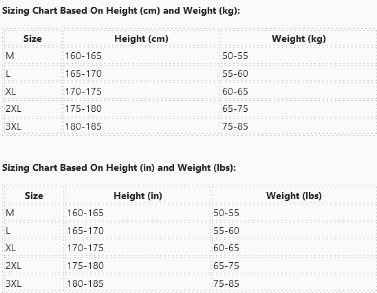 Sizing Chart Based On Height (cm) and Weight (kg):