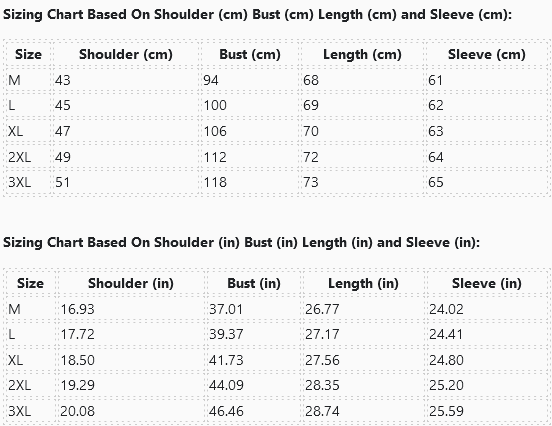 Sizing Chart Based On Shoulder (cm) Bust (cm) Length (cm) and Sleeve (cm):