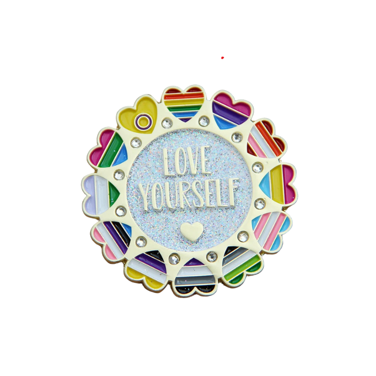 Dazzle your denim or punk out your purse with the Love Yourself Rainbow Enamel Pin—a tiny tribute to big pride and self-love that packs a powerful punch of color and charisma.