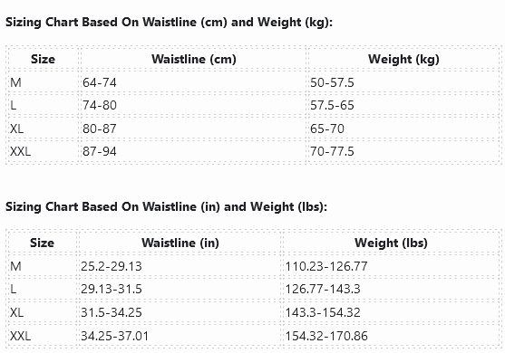 Sizing Chart Based On Waistline (cm) and Weight (kg):