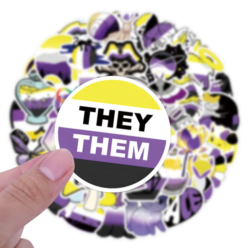 Each sticker is a little badge of courage and a big statement of support, echoing the nonbinary community’s diverse and dynamic nature. Whether you're decking out your laptop, spicing up your skateboard, or customizing your coffee mug, these stickers add a splash of pride and a dash of defiance against the norms. They're not just stickers; they're symbols of freedom and flags of fearless self-expression.