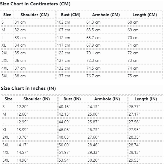 | Size | Shoulder (CM) | Bust (CM) | Armhole (CM) | Length (CM) |