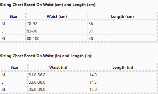 Sizing Chart Based On Waist (cm) and Length (cm):