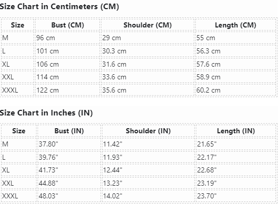 | Size | Bust (CM) | Shoulder (CM) | Length (CM) |