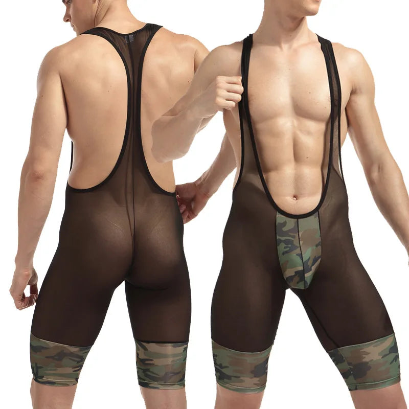 Embrace your daring side with the Men's Camouflage Mesh Jumpsuit Performance Costume, a bold and sexy ensemble that's tailor-made for the dynamic queer community. This isn't just a costume; it's a celebration of confidence, a symbol of sex appeal, and a nod to the vivacious energy of gay pop culture.