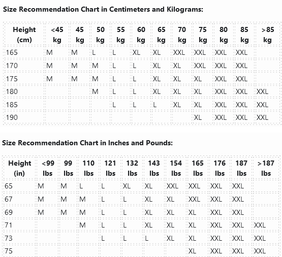 | 170 | M | M | M | L | L | XL | XL | XXL | XXL | XXL | |