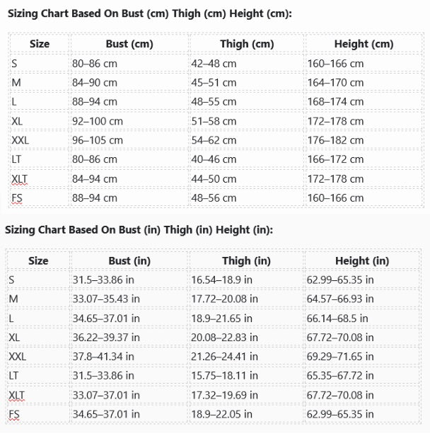 | Size | Bust (cm) | Thigh (cm) | Height (cm) |