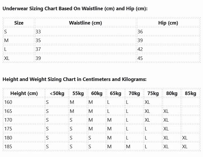 Underwear Sizing Chart Based On Waistline (cm) and Hip (cm):