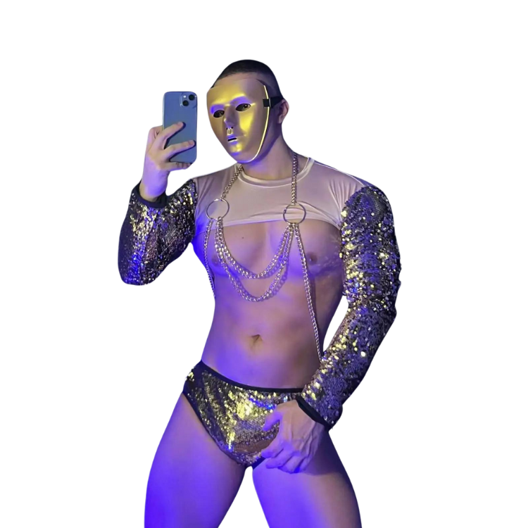 Step into the spotlight and own every room you enter with the Men's Muscle Golden Sexy Stage Costume Set – a dazzling, audacious outfit designed to accentuate your confidence and sex appeal. Tailored for the vibrant queer community, this ensemble is not just a costume; it's an embodiment of boldness, empowerment, and a proud nod to the flamboyant spirit of gay pop culture.
