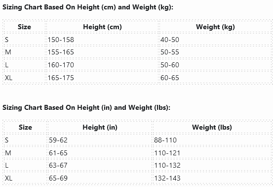 Sizing Chart Based On Height (cm) and Weight (kg):