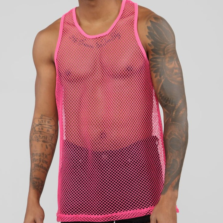 Honey, this tank is like the ultimate read: subtle, spicy, and oh-so-revealing. Picture it: you, strutting down the street in mesh, with the sun playing peek-a-boo with your skin. It's sheer genius, really. Every inch of you, from the gym-sculpted pecs to that cute little tattoo you thought no one would see, is on display like a work of art in a gallery of fabulousness.