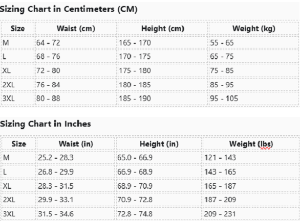 | Size | Waist (cm) | Height (cm) | Weight (kg) |