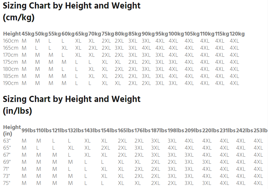 | 190cm | M | M | M | M | L | L | XL | XL | 2XL | 2XL | 3XL | 3XL | 4XL | 4XL | 4XL | 4XL |