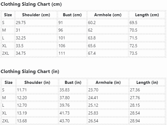 | Size | Shoulder (cm) | Bust (cm) | Armhole (cm) | Length (cm) |